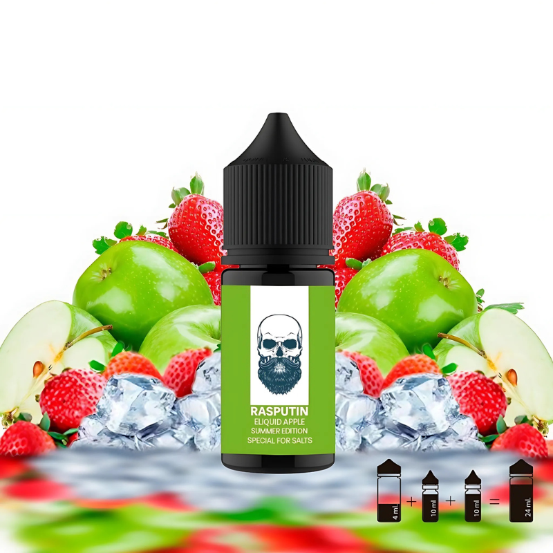 Rasputin Apple de Daruma es una mezcla sublime de manzanas frescas y fresas dulces, con un fondo de dulzor helado que realza cada inhalación.