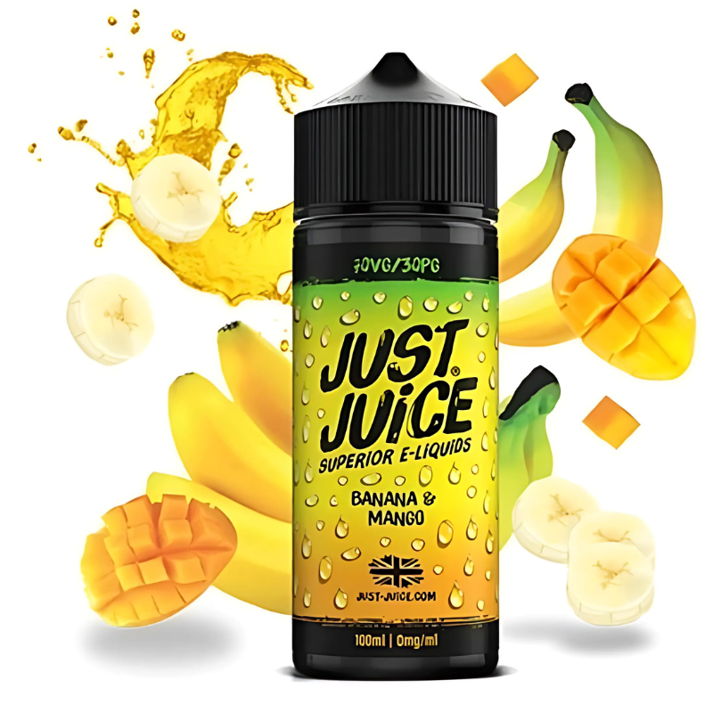 Longfill Just Juice Banana & Mango. Sumérgete en una deliciosa mezcla de frutas tropicales con cada inhalación. La dulzura suave y cremosa del plátano se combina perfectamente con el exótico sabor del mango, creando una sinfonía de sabores que te transportará a playas doradas y paisajes exuberantes.